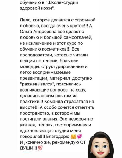 Со временем спрос на высококлассных специалистов в сфере косметологии будет только увеличиваться даже при наличии конкуренции. Школа студия здоровой кожи проводит обучение косметиков 4 и 5 разрядов, курсы повышения квалификации с выдачей свидетельств государственного образца. На базе студии проходят практические семинары и мастер-классы.